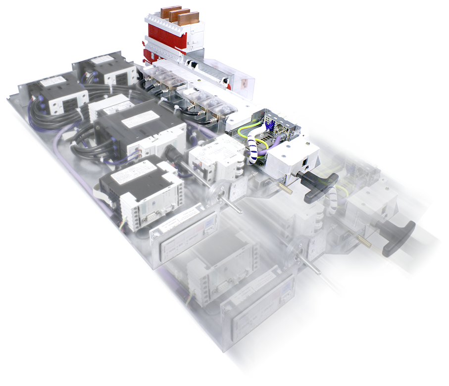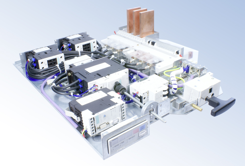 Completed drawer-unit with motor-starter up to 22kW with profi-bus connected to the vertical bus-section via busbar-module and cable-module.