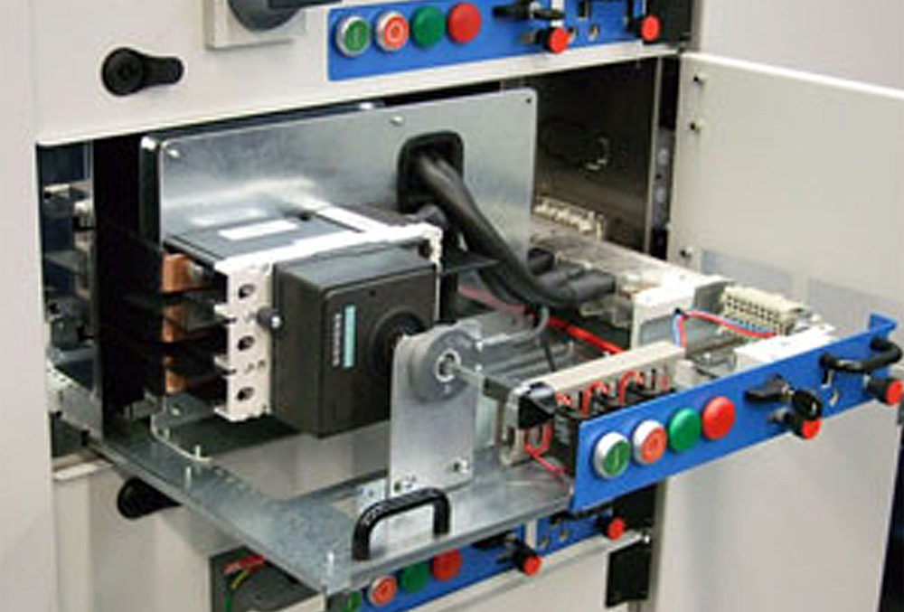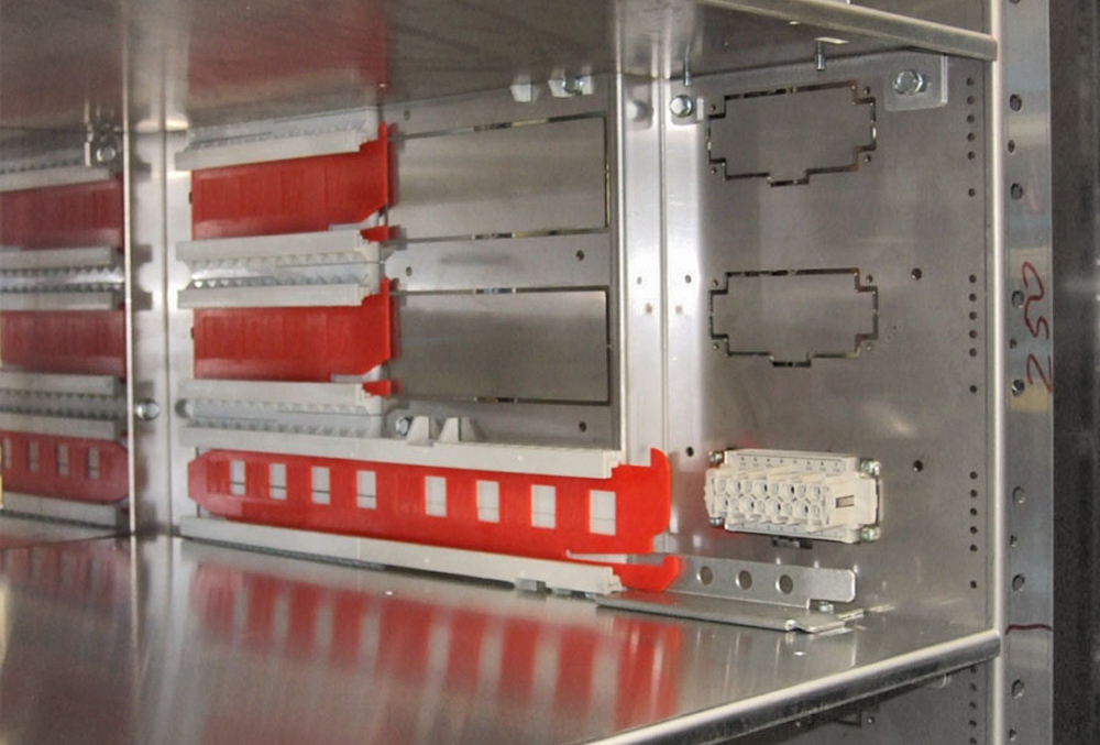 It is easy to implement the “energy-and signal-transfer-wall” to existing panel frames. Together with the contacting module the whole system becomes a self protecting unit with highest characteristics concerning short-circuit and is additionally proofed by “IPH in Berlin” to be arc-safe. The vertical bus-section which is completely encapsulated from phase to phase, the individual cable-modules located where necessary are ready to take individual drawers in steps of 75mm. The “energy-and signal-transfer-wall” can be easily installed within each switchboard and makes withdrawable technology together with the contacting module available and this at the highest level of personal safety.